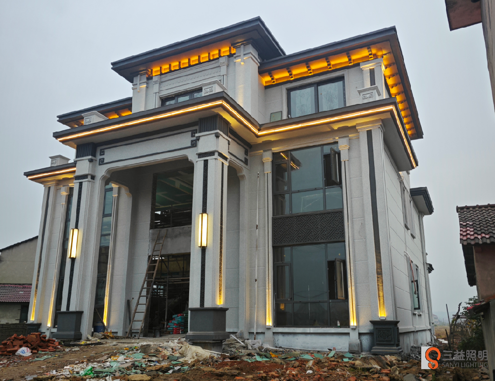 大福劉府是三層新中式別墅,外墻使用藝術仿石漆,搭配暖白色燈光,效果溫馨又豪氣。